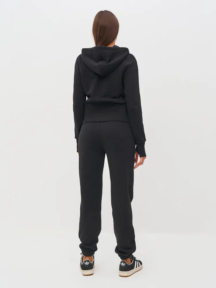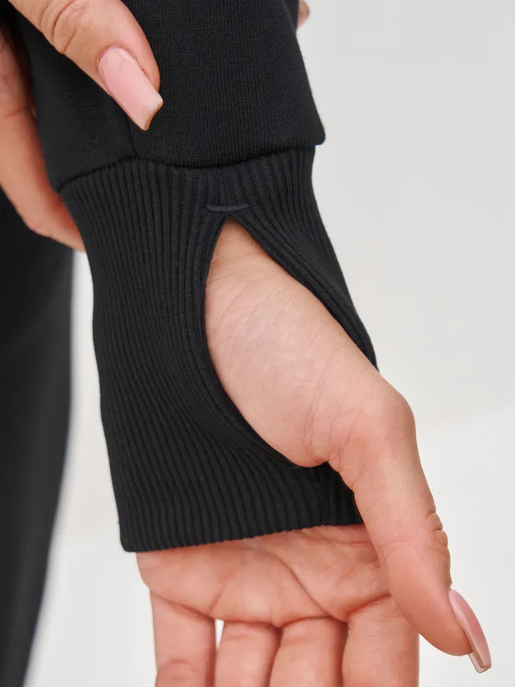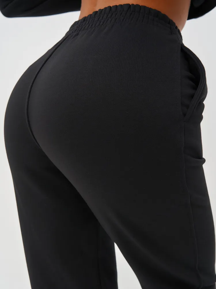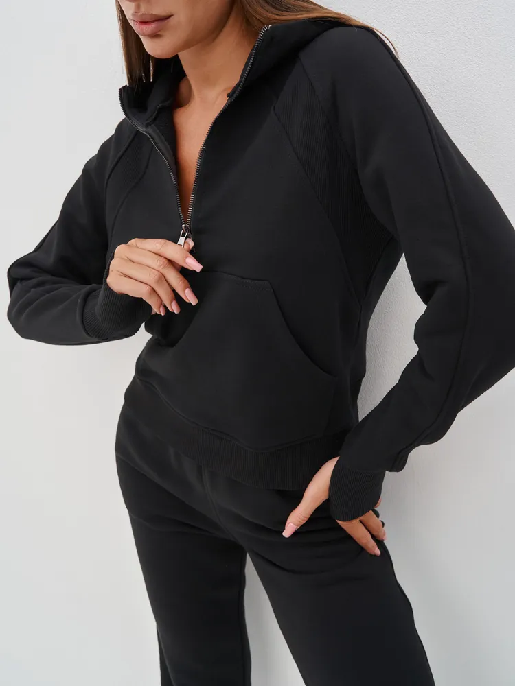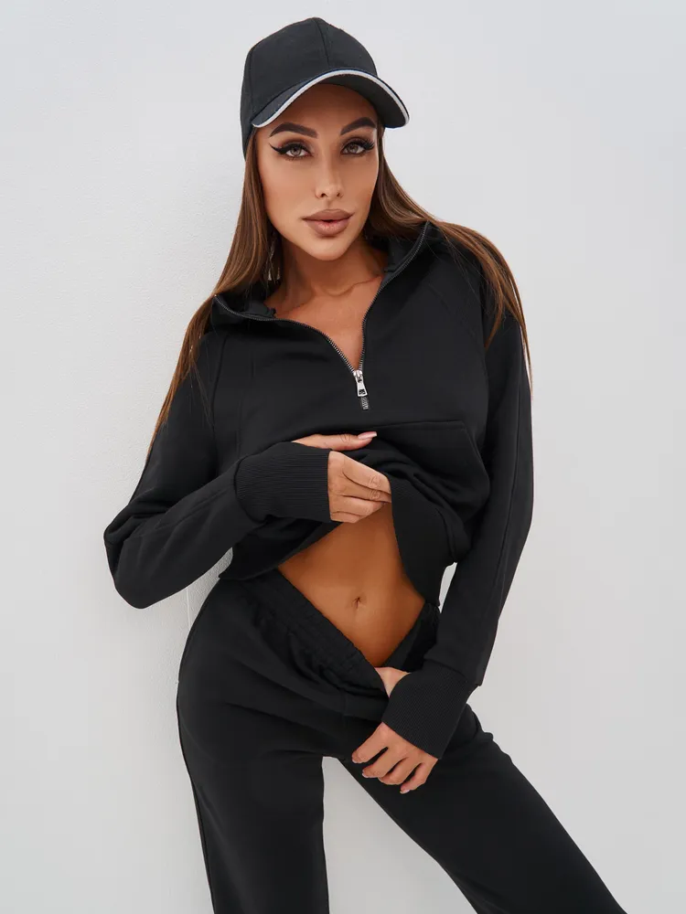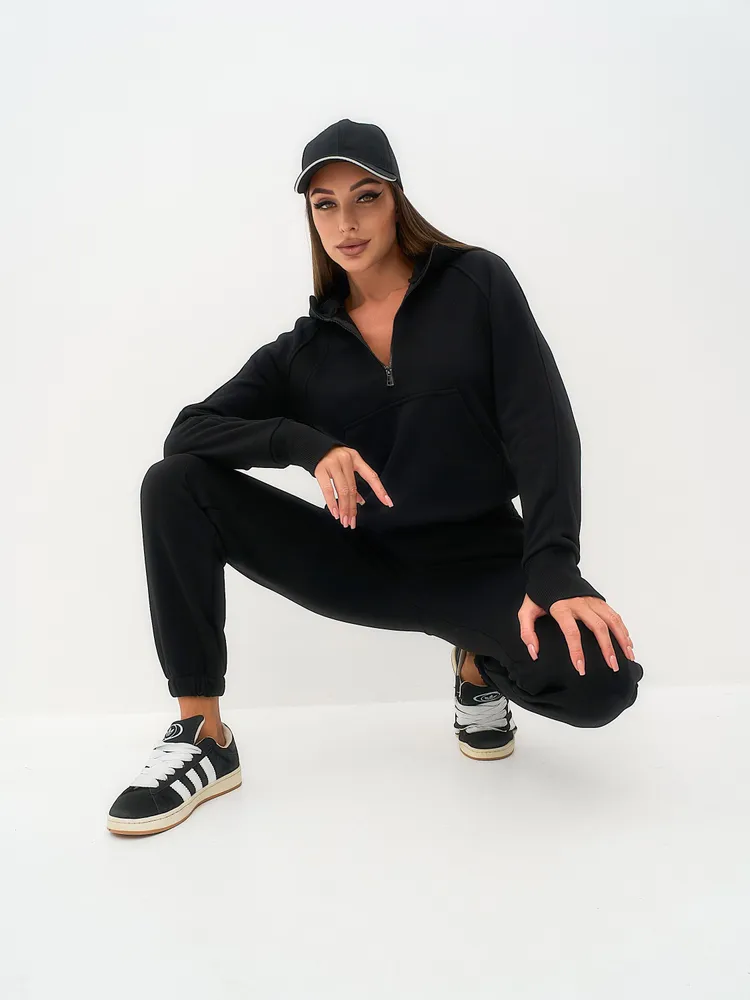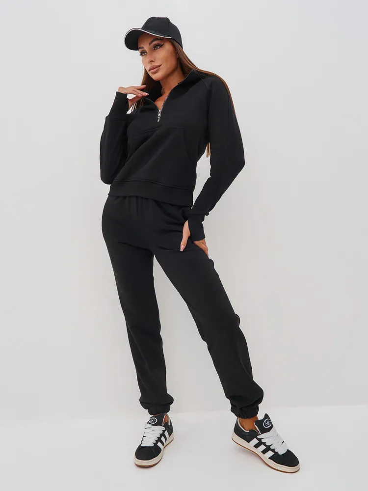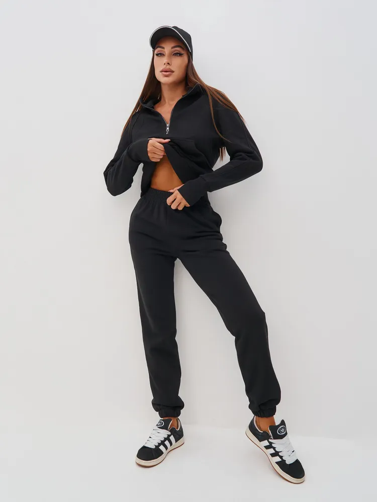 Элегантный и женственный черный спортивный костюм на молнии от бренда MB Creation by Bachani. Трикотажный костюм - мягкий, легкий, приятный к телу комплект, который подарит Вам уют и комфорт. Футер (трехнитка петля) без начеса - это материал состоящий из натурального хлопка, дышащий комфортный, прекрасно подходит для любого времени года- весна, лето, осень.
